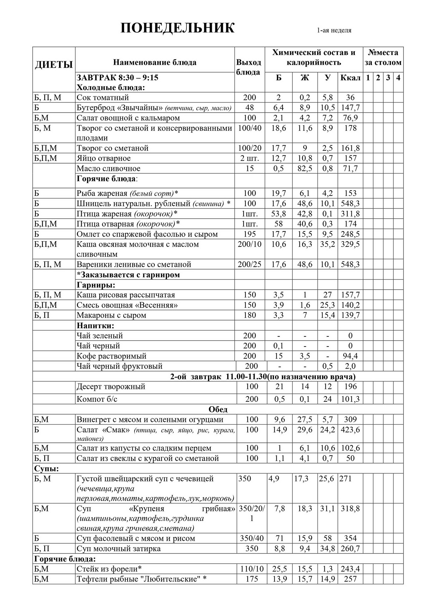 Здоровое диетическое питание является важной составляющей здорового образа жизни, поэтому сбалансированное пятиразовое питание в санатории организовано по индивидуальному заказу в одну смену, а для больных сахарным диабетом и лиц, нуждающихся в частом и дробном питании, шестиразовое (дополнительно предлагается второй завтрак). Для наших гостей мы разработали сбалансированное 14 дневное перспективное заказное меню по диетам Б, М, Н, П, в том числе с фирменными блюдами санатория.