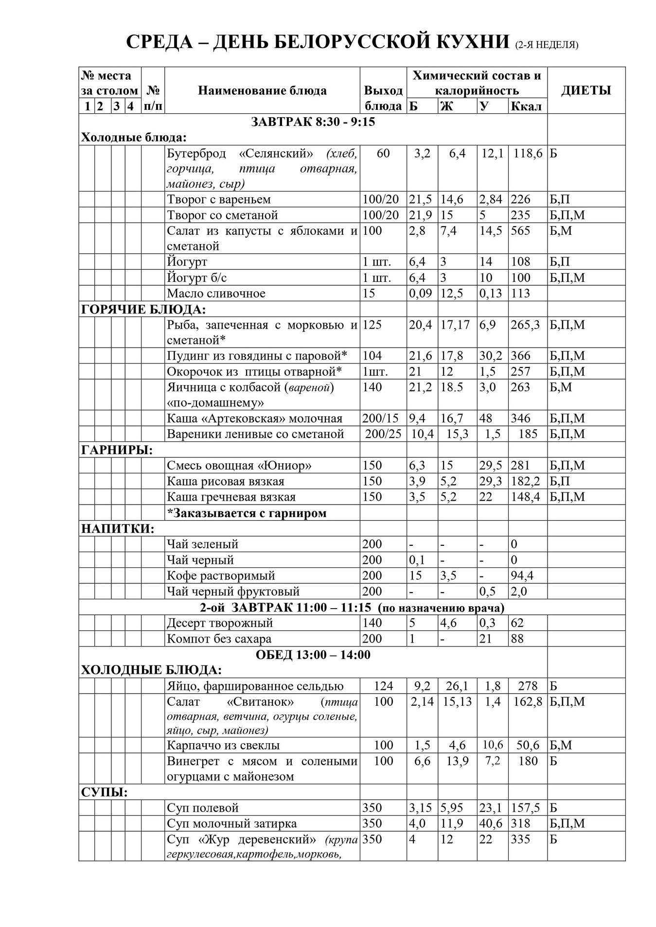 Каждую среду для наших гостей мы проводим Дни Белорусской (национальной) кухни. В меню включены блюда, в которых много целесообразного, исторически обусловленного, соответствующего национальным вкусам, образу жизни и климату нашей страны. Отличительной особенностью меню этих дней является содержание блюд из картофеля, колбас, круп, грибов, свинины…